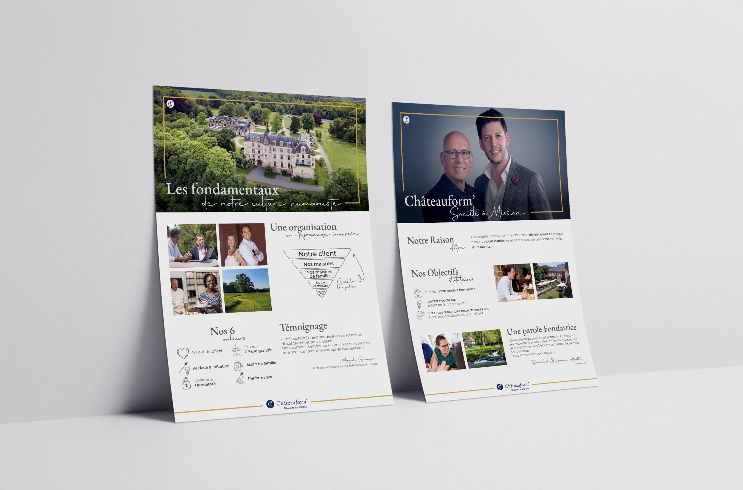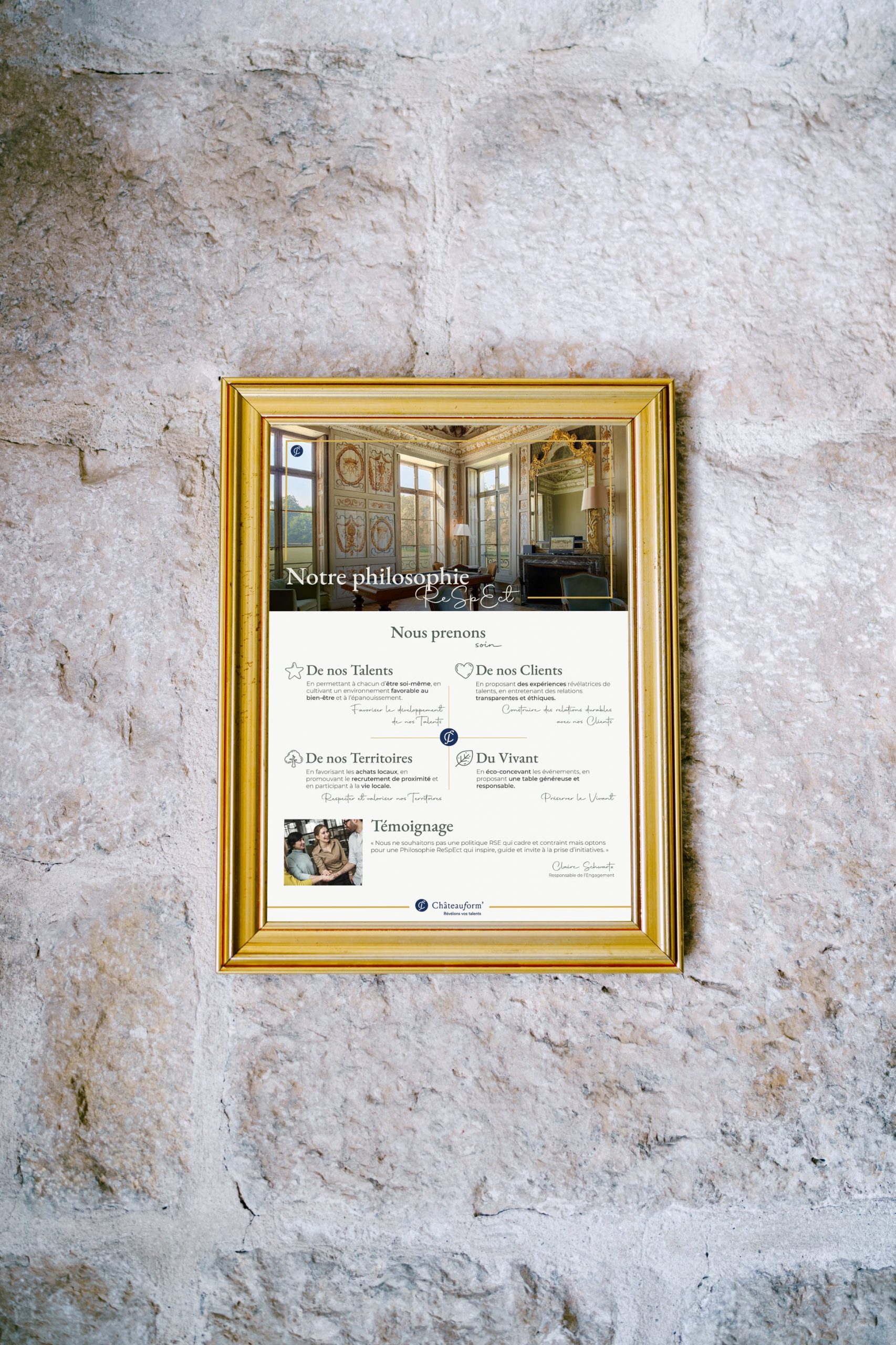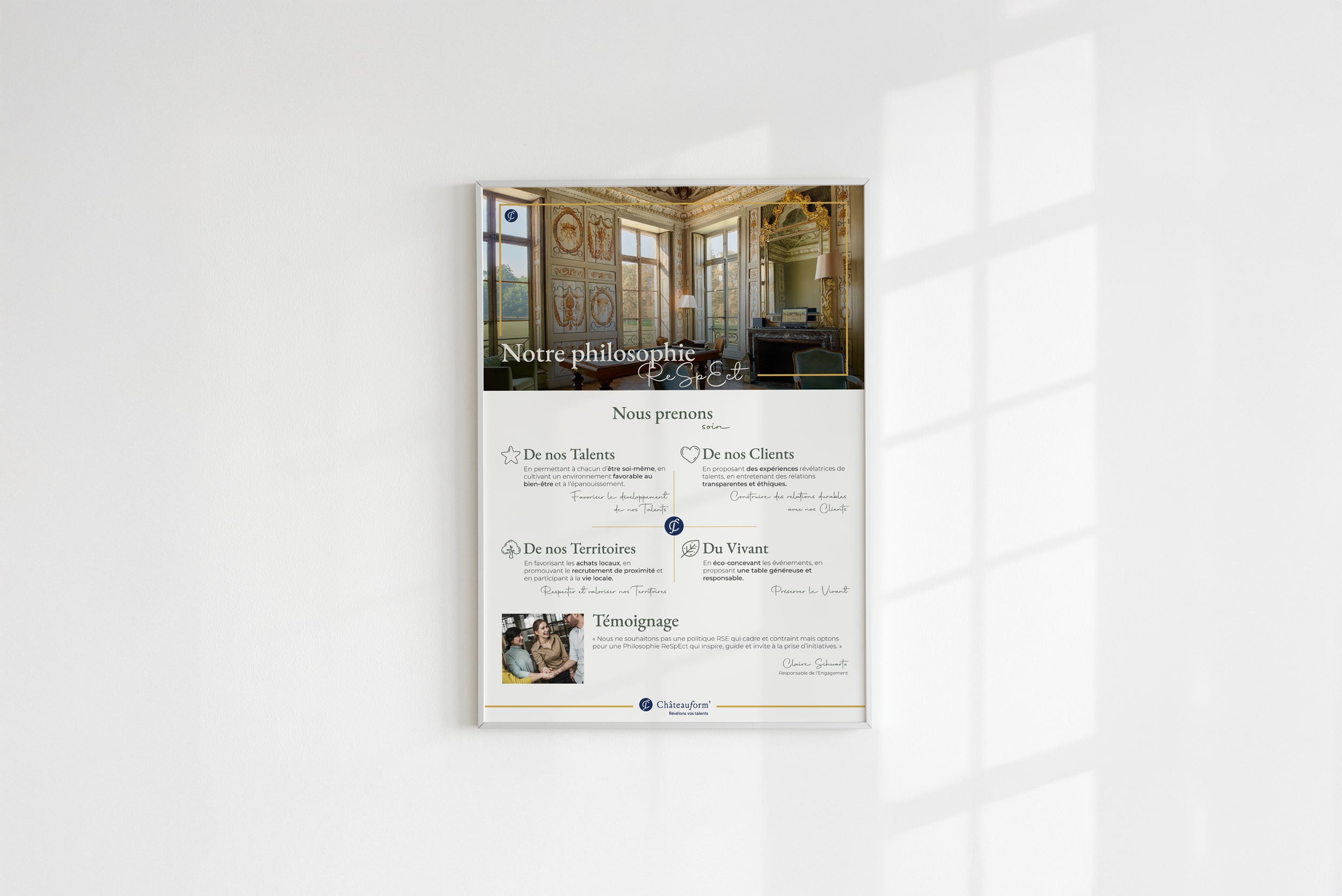 Les quatre posters ont pour objectif de mettre en avant les valeurs du groupe Châteauform’. Chaque poster est caractérisé par une cohérence graphique, mais aussi par la mise en page.