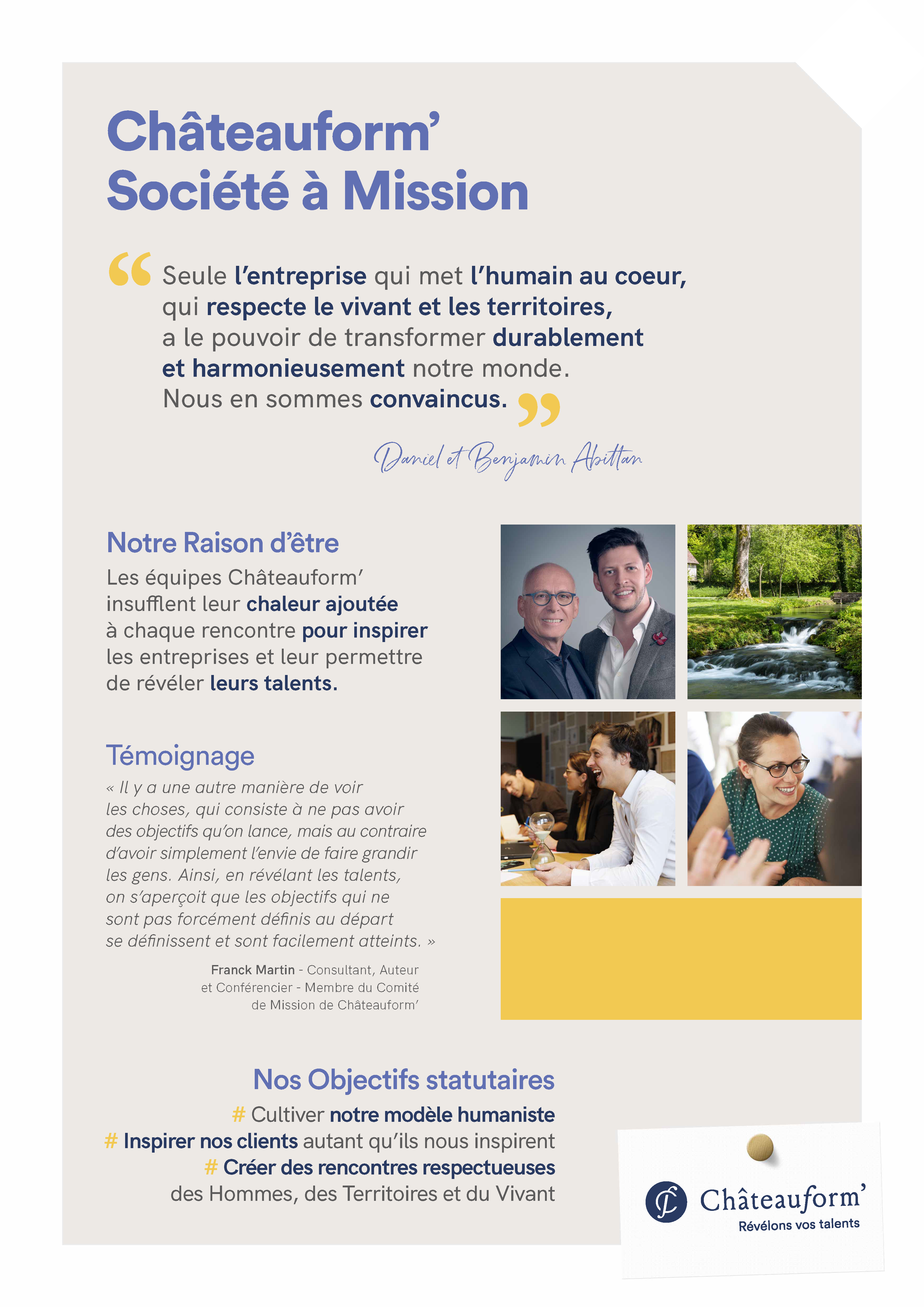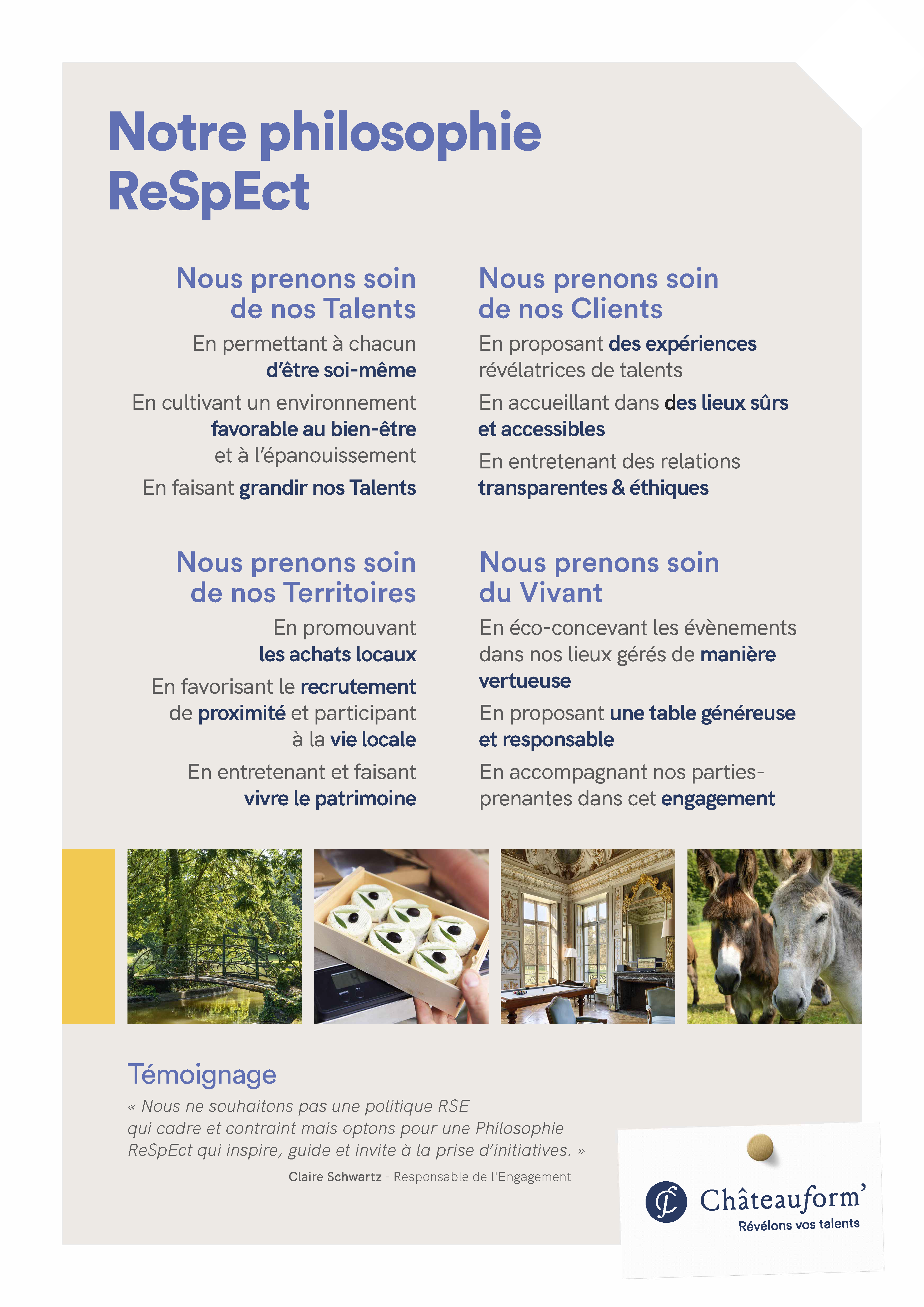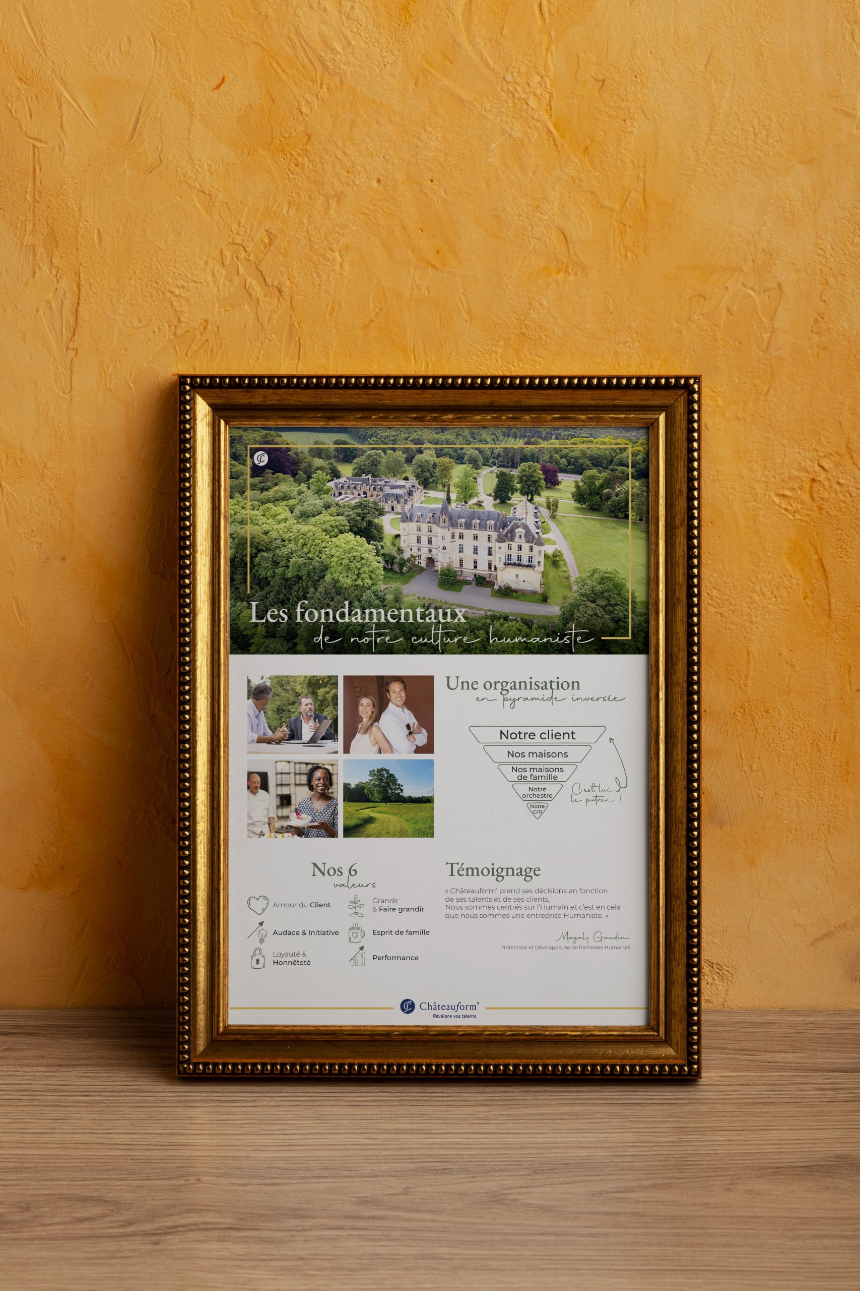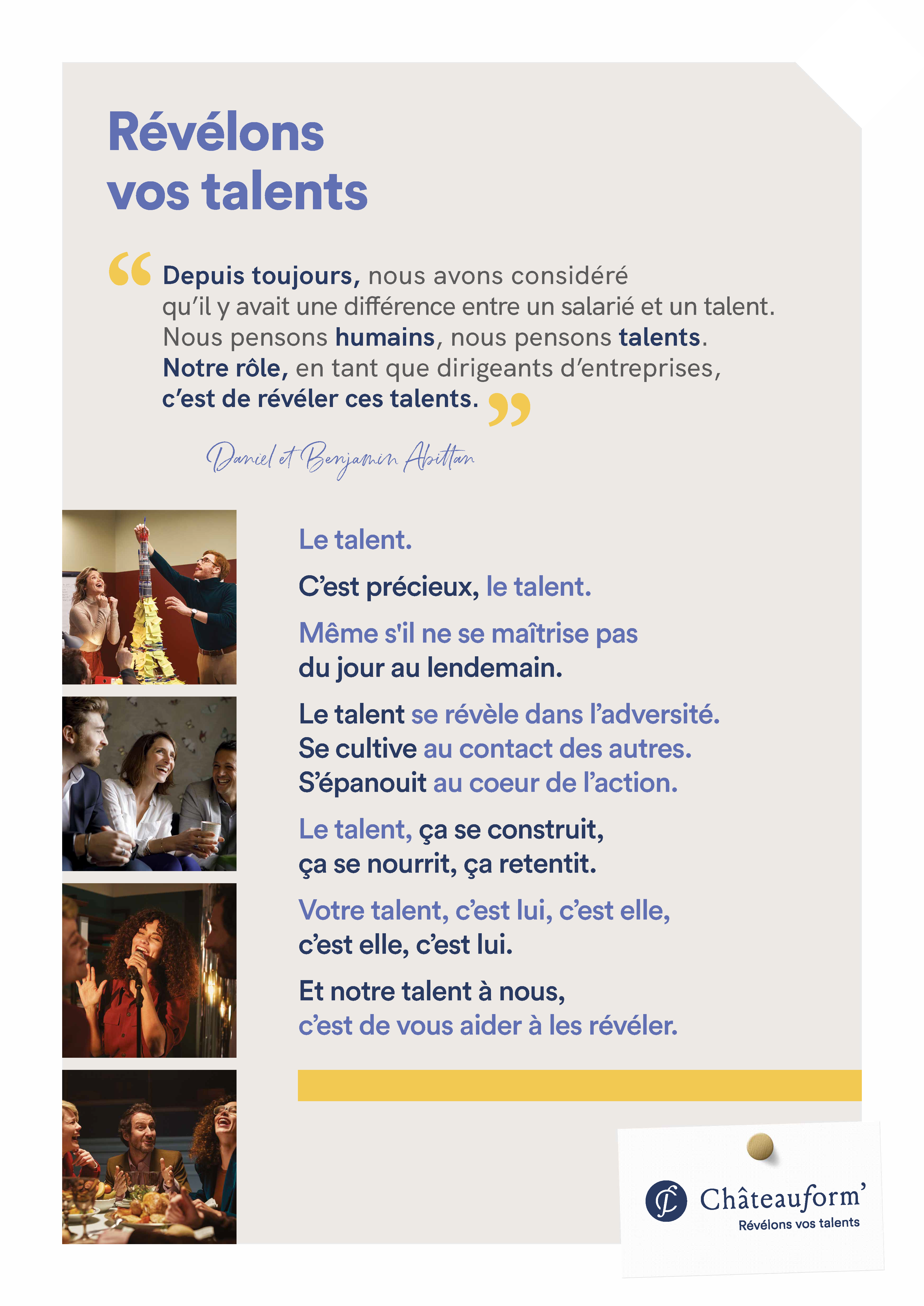 Les quatre posters ont pour objectif de mettre en avant les valeurs du groupe Châteauform’. Chaque poster est caractérisé par une cohérence graphique, mais aussi par la mise en page.