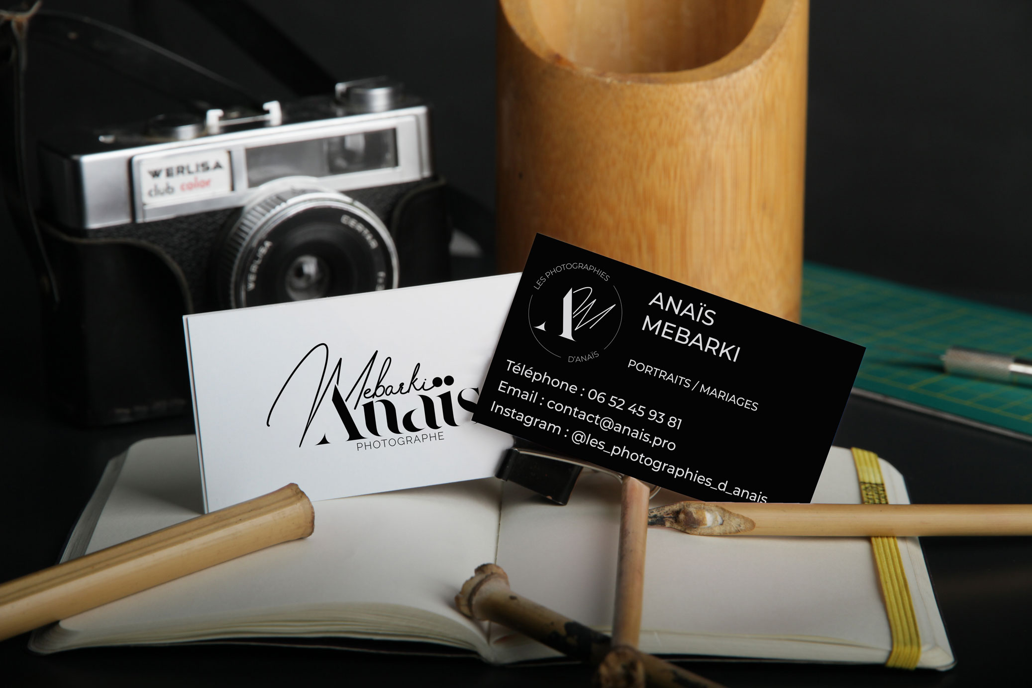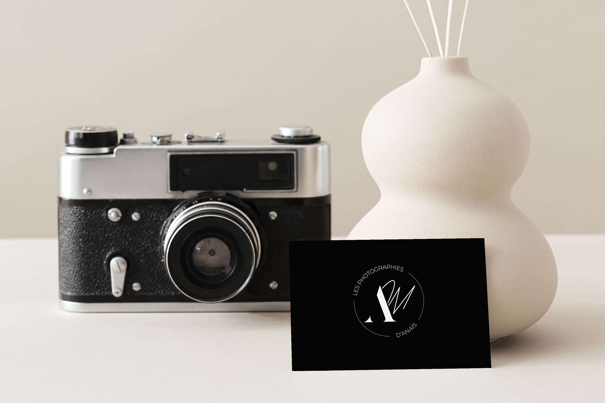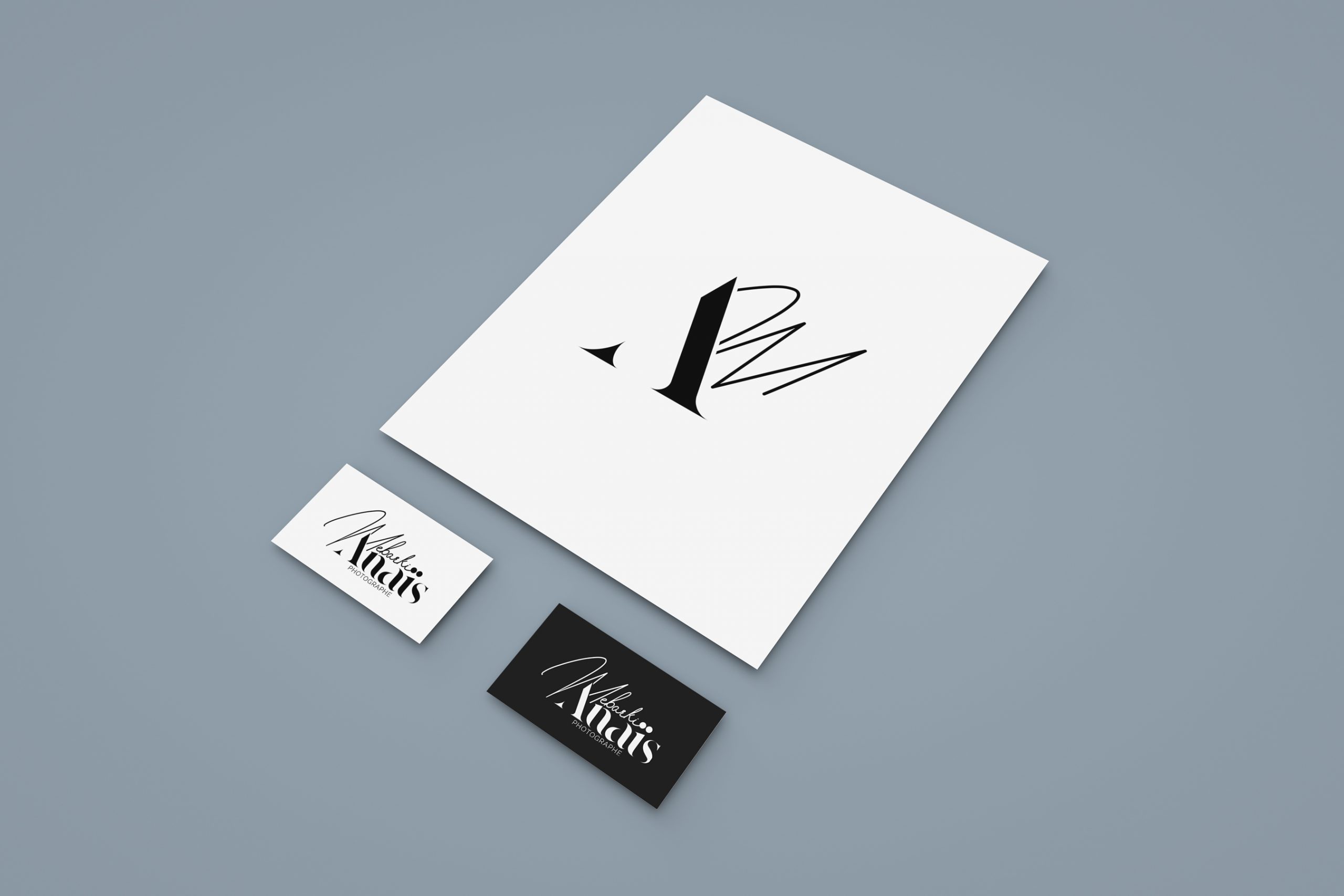 La particularité du logo repose sur une écriture manuscrite et une écriture cursive. L’intégration du nom complet « les photographies d’Anaïs », n’était pas possible sur plusieurs déclinaisons. J’ai décidé de faire plusieurs déclinaisons du logo, ce qui pourra permettre de choisir les supports sur lesquels les placer. La carte de visite en photo en dessous est juste un exemple de mise en situation, ce n’est pas forcément le meilleur contenu/design à intégrer.