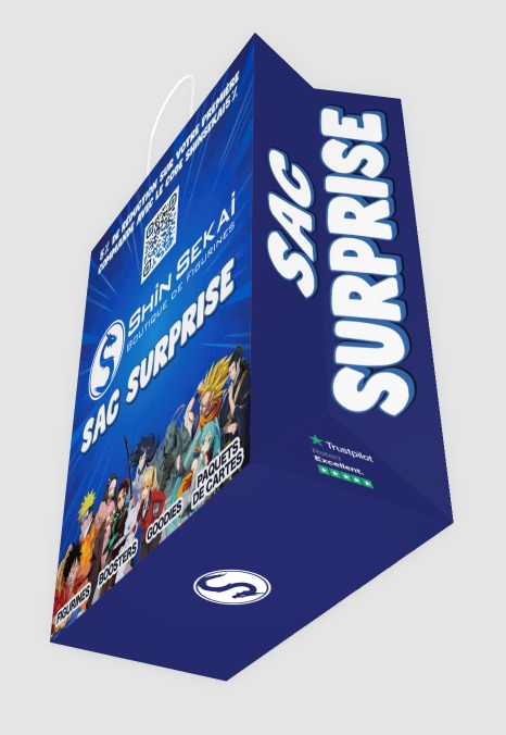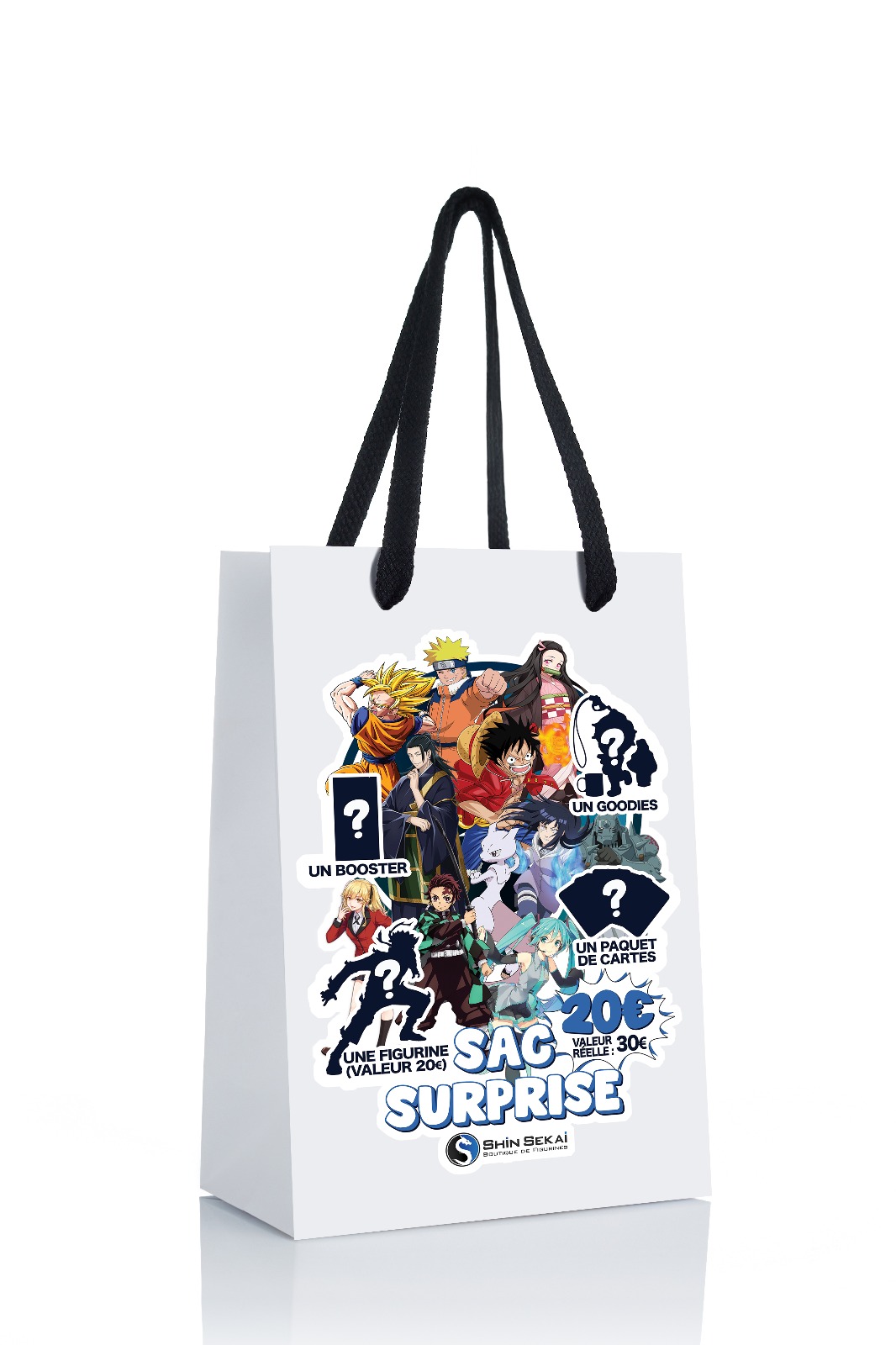 Le but ici, pour les sacs en vitrine, était de mettre en avant les prix et le fait que ce sont des sacs surprises. Avec les produits que l’on peut retrouver à l’intérieur et quelques personnages connus des animés. Pour le sac donné au client, on garde toujours les informations importantes du sac surprise en ajoutant un QR CODE de redirection vers le site et on ajoutera un code promo applicable.