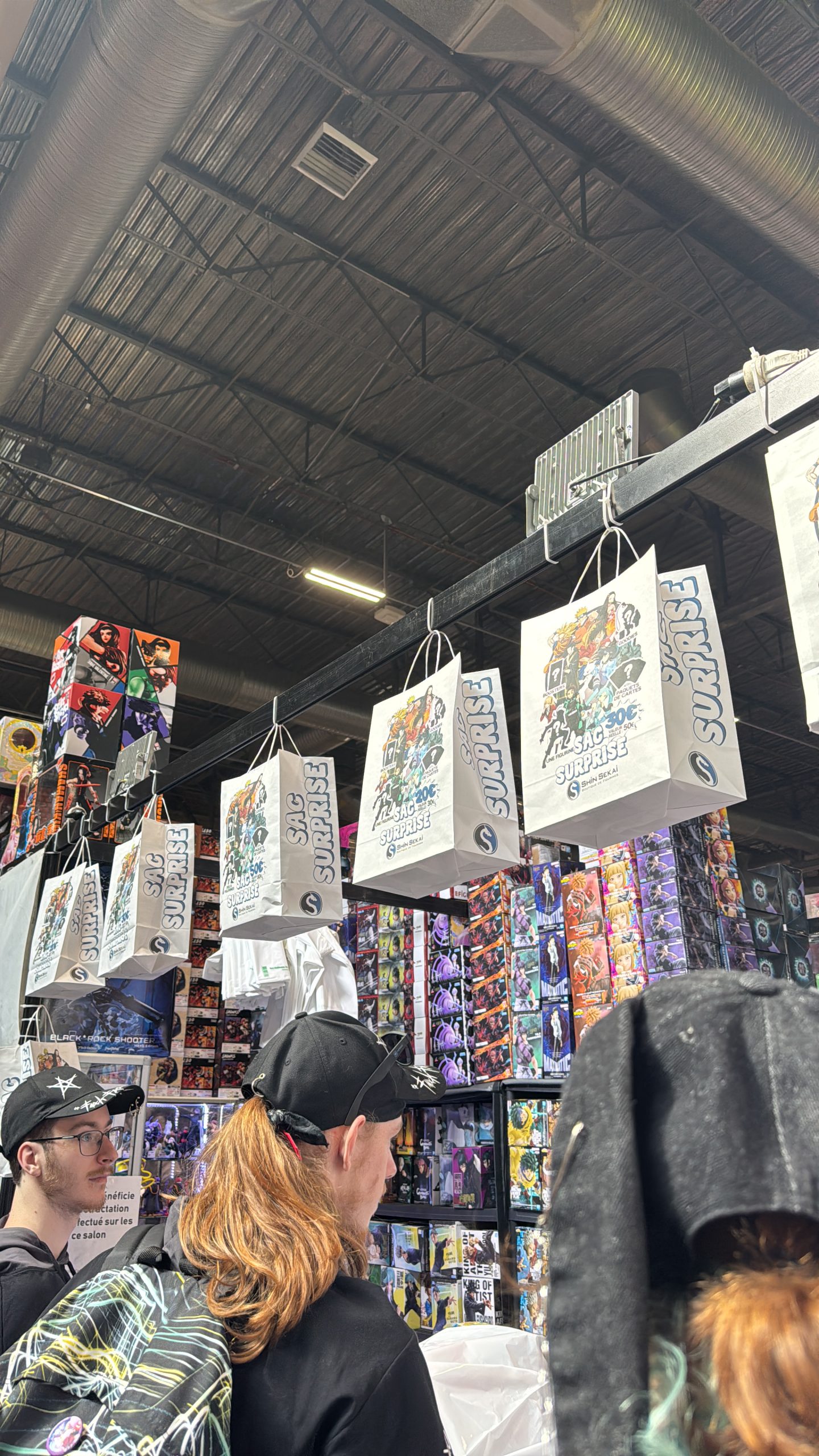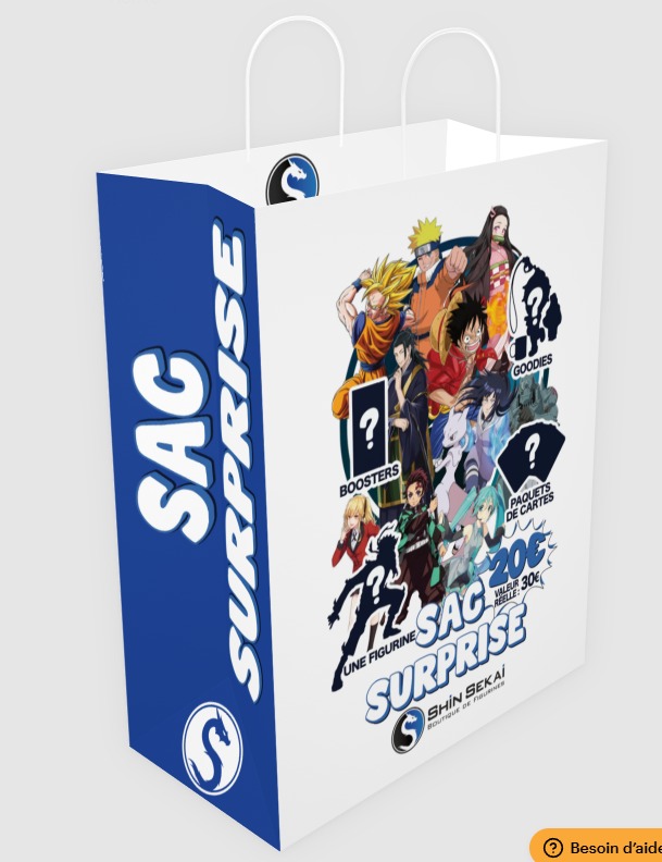 Shin Sekai m’a confié la création des visuels des nouveaux sacs que nous retrouvons aujourd’hui en convention. Il y a trois sacs surprises avec différents prix, qui sont mis en vitrine pour informer les futurs acheteurs : sacs surprises de 20€, 30€ et de 50€. Ensuite, il y a un autre sac qui sera donné à l’acheteur avec ses surprises dedans.