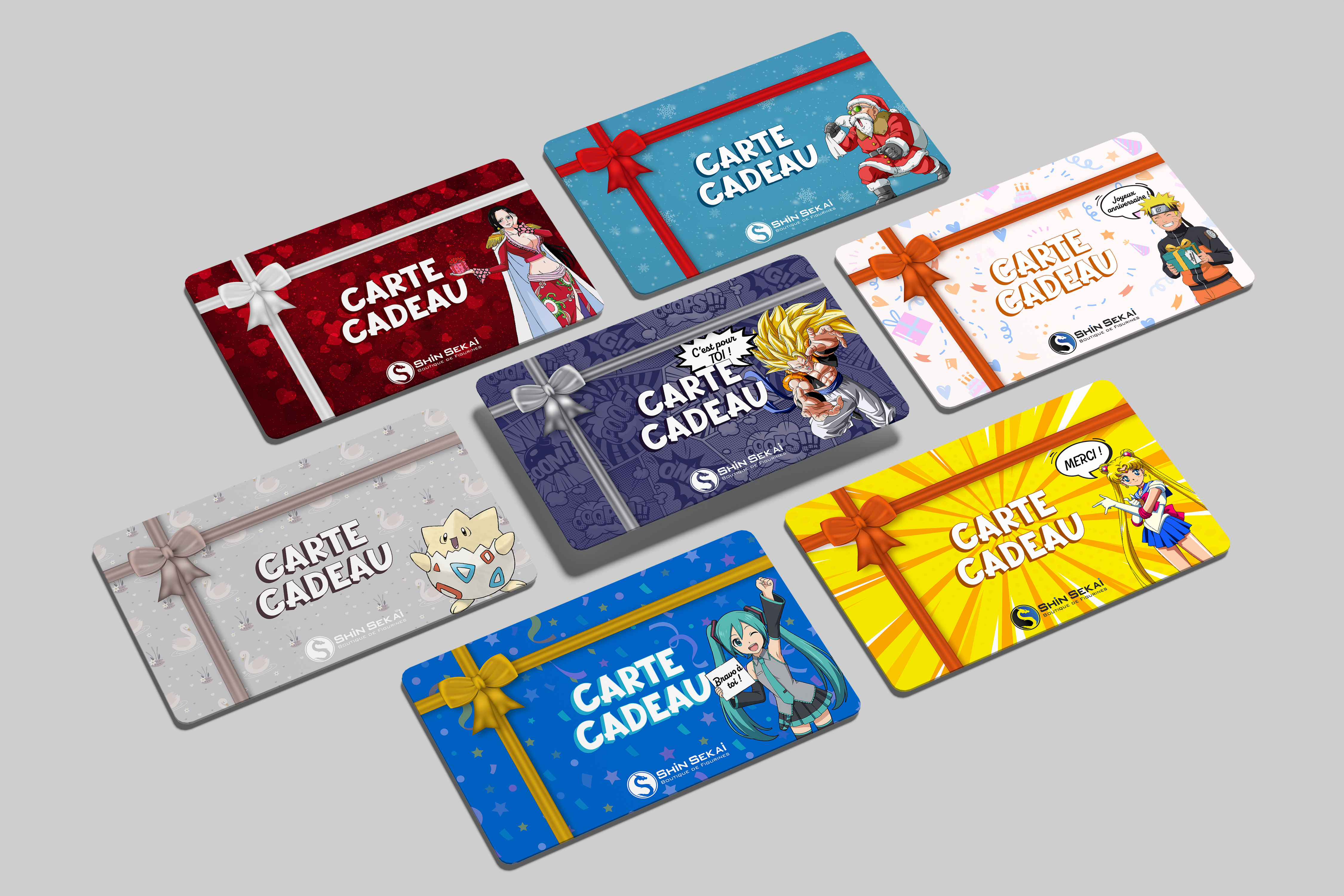 Il s’agit d’un ensemble de 10 cartes cadeaux illustrées, déclinées selon différentes thématiques (anniversaire, naissance, mariage, Saint-Valentin, etc.) et intégrant des personnages issus de la culture animée et pop culture, dans un style cohérent et adaptable à l’univers visuel de Shin Sekai.